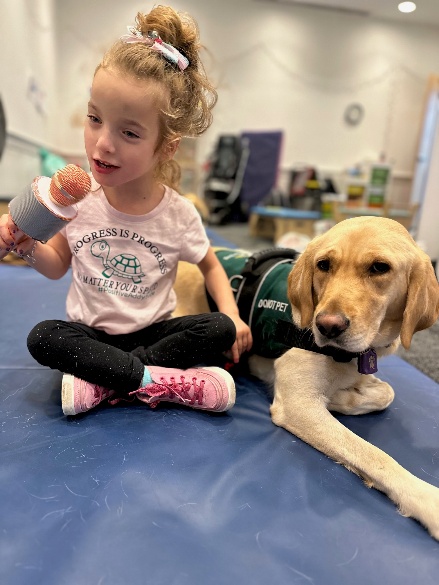 Fairway is classified as a mobility dog. She helps Addy get through doors by jumping up and pushing the openers for accessible doorways. Fairway also helps Addison pick things up off the floor that she drops, which is a huge thing. “Say she drops her water bottle on the floor. She can’t get it. Fairway can pick that up, jump up on a table, drop it in front of her. Then Addison can reach it again and she doesn’t need to call Mom and Dad over. That’s the biggest thing that she does right now,” Kristi said. It gives Addy independence in ways she didn’t have before.